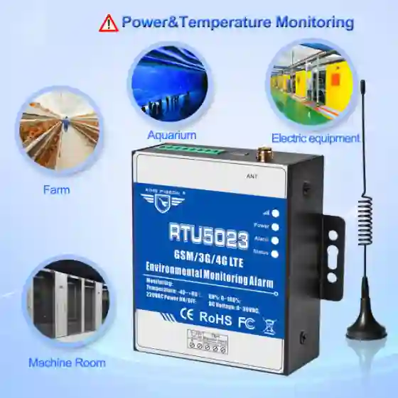 The RTU5023 GSM 2G Environmental Monitoring Alarm is a reliable and intelligent solution designed to monitor temperature, humidity, and power supply status in real time. It instantly sends SMS notifications or phone calls whenever temperature or humidity levels exceed preset limits or when a power failure occurs.